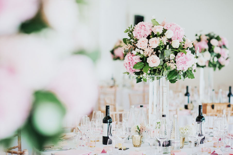Charlotte and Michael chose blowsy pink roses, hydrangea and shiny green foliage. Vintage tealights glinting amongst the flowers gave this wedding a feeling of old-world glamour.